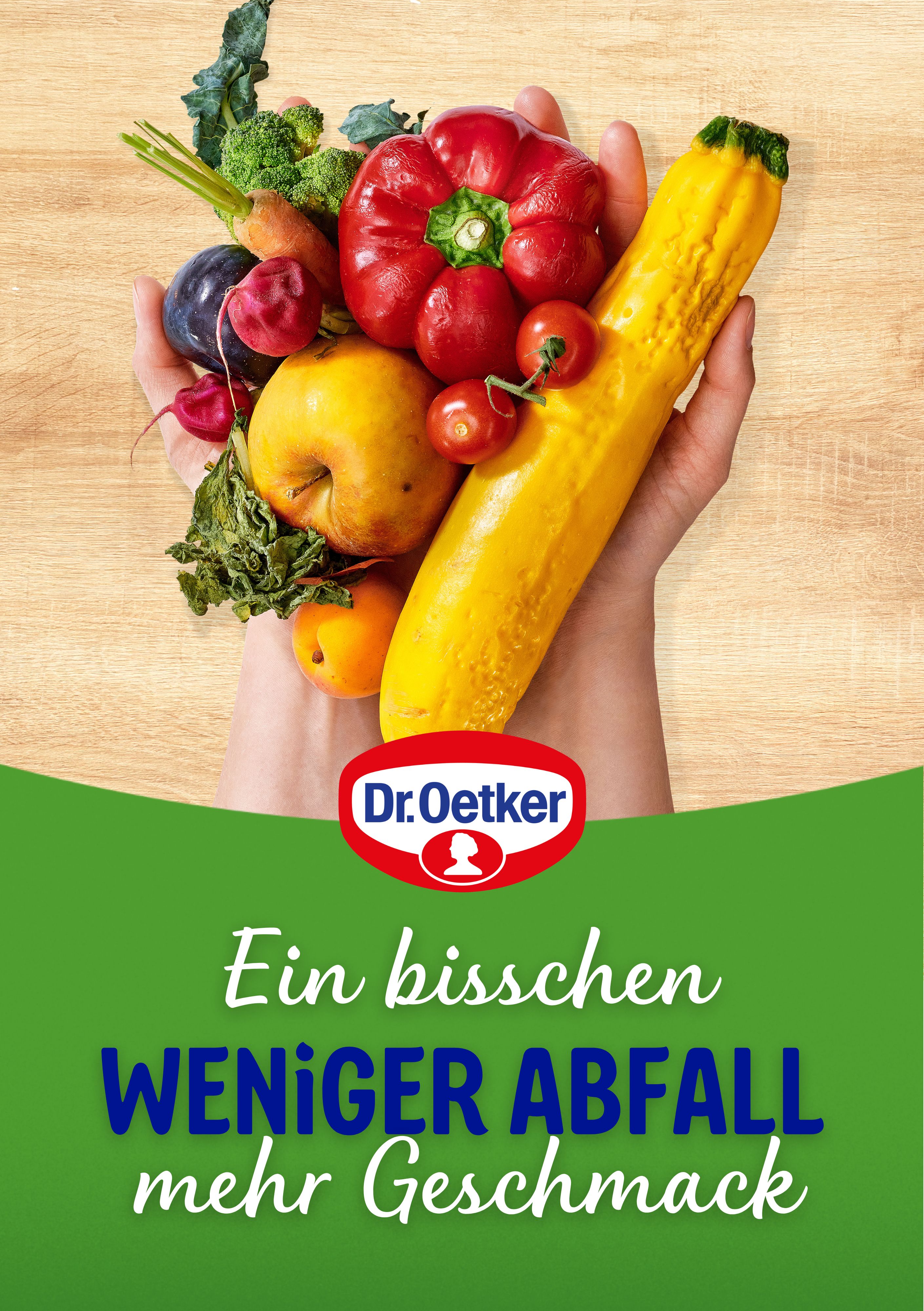 Mit unserer aktuellen Kampagne "A little less waste, big taste" ermutigen wir bei Dr. Oetker ab September verstärkt unsere Verbraucher*innen, gegen Lebensmittelabfälle aktiv zu werden. Den Kern der Kampagne bilden kreative und neu gedachte Rezepte, die zur vielfältigen und variablen Kombination von Lebensmitteln animieren. Vom Karotten-Wurzelbrot mit Pesto über ein goldenes Karamell aus Bananenschalen bis zu Pizza Margherita mit Rucola und Antipasti – gebündelt werden die inspirierenden Rezepte zur Vermeidung von Lebensmittelabfällen in einem Booklet mit zahlreichen Tipps und Tricks rund um das Thema, das auf der Website zu finden ist.