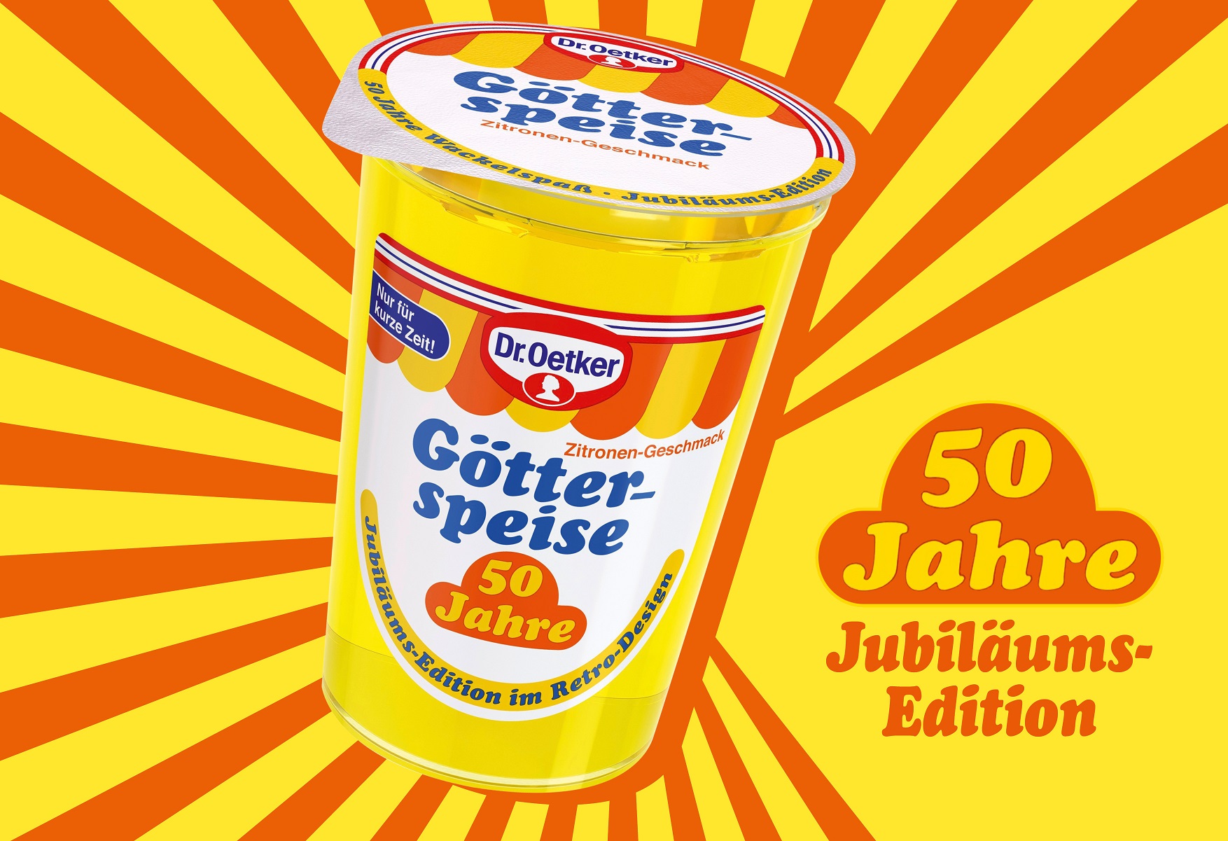 Dr. Oetker bringt zum 50. Geburtstag der Götterspeise eine XXL Jubiläums-Edition Zitronen-Geschmack im Retro-Design raus.