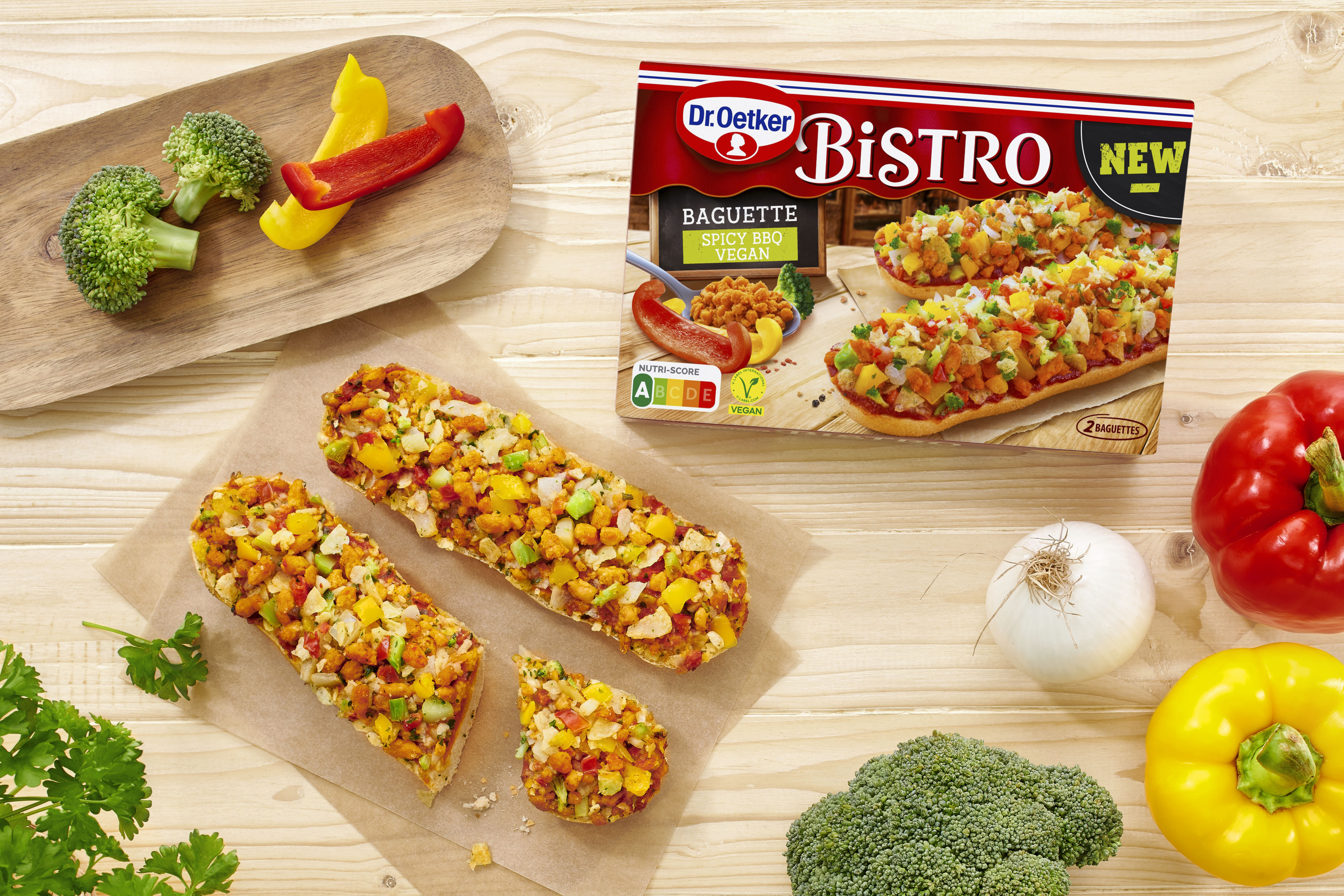 Ab Juni 2023 erweitert Dr. Oetker sein Tiefkühlsnack-Sortiment um das erste vegane Bistro Baguette in der Sorte Spicy BBQ Vegan. Die zwei knusprigen Baguettehälften je Packung sind neben einer würzigen Tomatensoße mit Brokkoliröschen, Zwiebeln, Paprika, Tomaten und einer Auflage aus Erbsenprotein belegt. Chipsbrösel sorgen für einen besonderen Crunch. Ein Hauch von Chili und eine leichte BBQ-Note runden die Rezeptur ab, die vegane Genussmomente für alle verspricht, die sich pflanzlich ernähren oder einfach etwas Neues ausprobieren möchten.