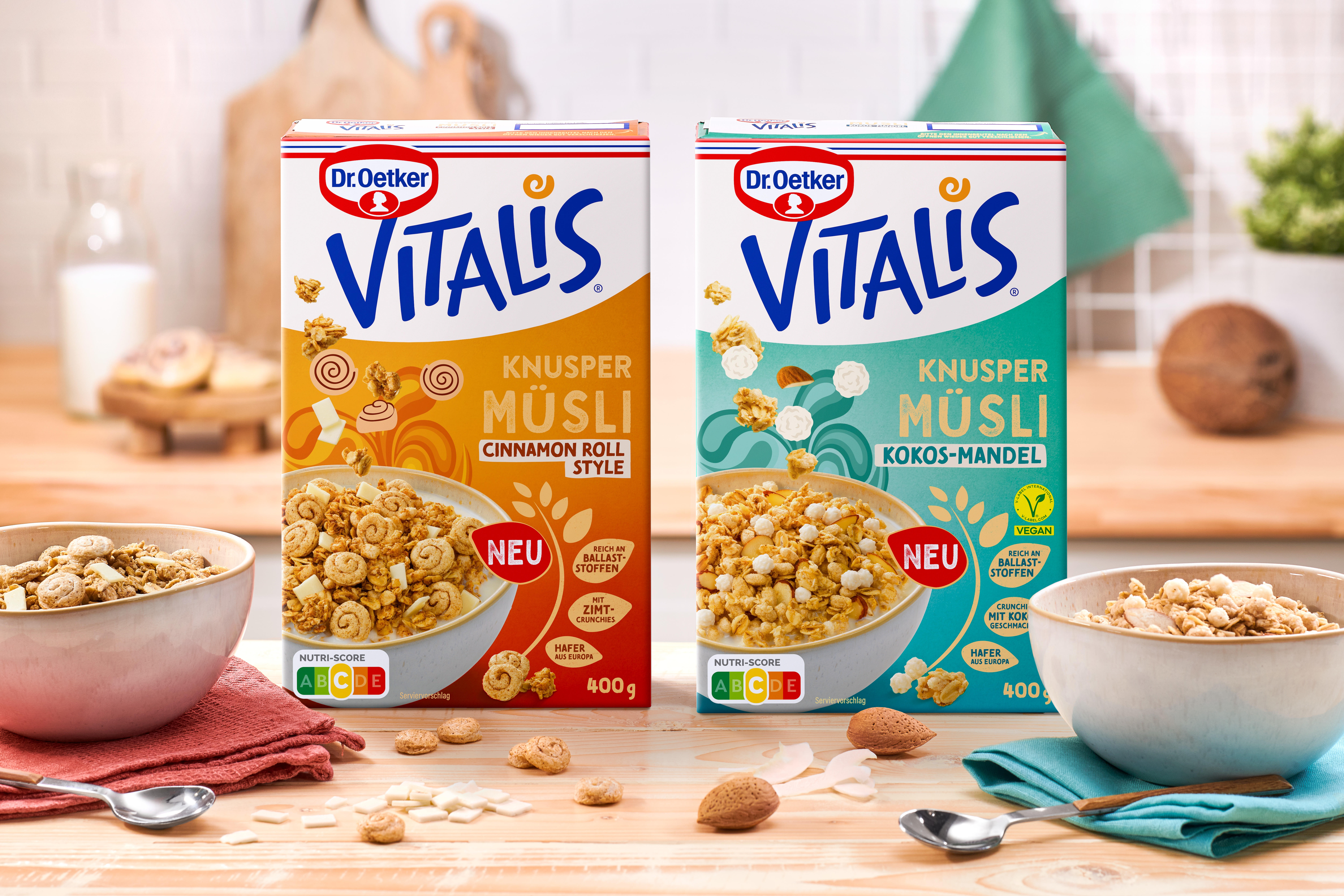 Foodies, aufgepasst: Mit dem Vitalis Knusper Müsli Cinnamon Roll Style und dem Vitalis Knusper Müsli Kokos-Mandel sorgt Dr. Oetker ab Juli 2025 für neue Geschmacksimpulse im Müsli-Segment. Die trendigen Sorten sprechen insbesondere Verbraucherinnen und Verbraucher an, die gerne mit einem genussvollen Knuspermüsli in den Tag starten. Das Vitalis Knusper Müsli Cinnamon Roll Style enthält Granola mit hochwertigem Zimt, kleine Zimt-Crunchies sowie weiße Fettglasur-Plättchen und sorgt somit für ein knusprig-zimtiges Highlight am Morgen. Kokos-Fans kommen mit dem Vitalis Knusper Müsli Kokos-Mandel auf den Geschmack: Crunchige Mini-Kokos-Balls, knackige Mandeln und ein Granola mit feinem Kokos-Geschmack bilden eine harmonische Geschmackskomposition. Die Rezeptur des Knusper Müslis Kokos-Mandel enthält keine tierischen Bestandteile und ist somit vegan – gut zu erkennen an dem offiziellen V-Label auf der Verpackung. Beide Produkte enthalten wertvolle Vollkorn-Haferflocken und sind reich an Ballaststoffen.