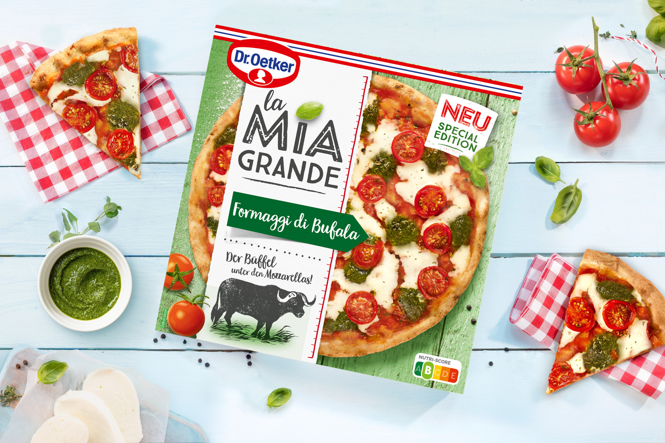 Alle La Mia Grande Varianten tragen den Nutri-Score auf der Vorderseite der Verpackung. So auch die neue La Mia Grande Formaggi di Bufala, die mit einem hellgrünen B gekennzeichnet ist. Damit möchte Dr. Oetker Konsumentinnen und Konsumenten mehr Vergleichbarkeit bei der Produktauswahl und somit eine bewusste Kaufentscheidung ermöglichen. Gleichzeitig kommt das Unternehmen den Zielen aus der Dr. Oetker Sustainability Charter nach.