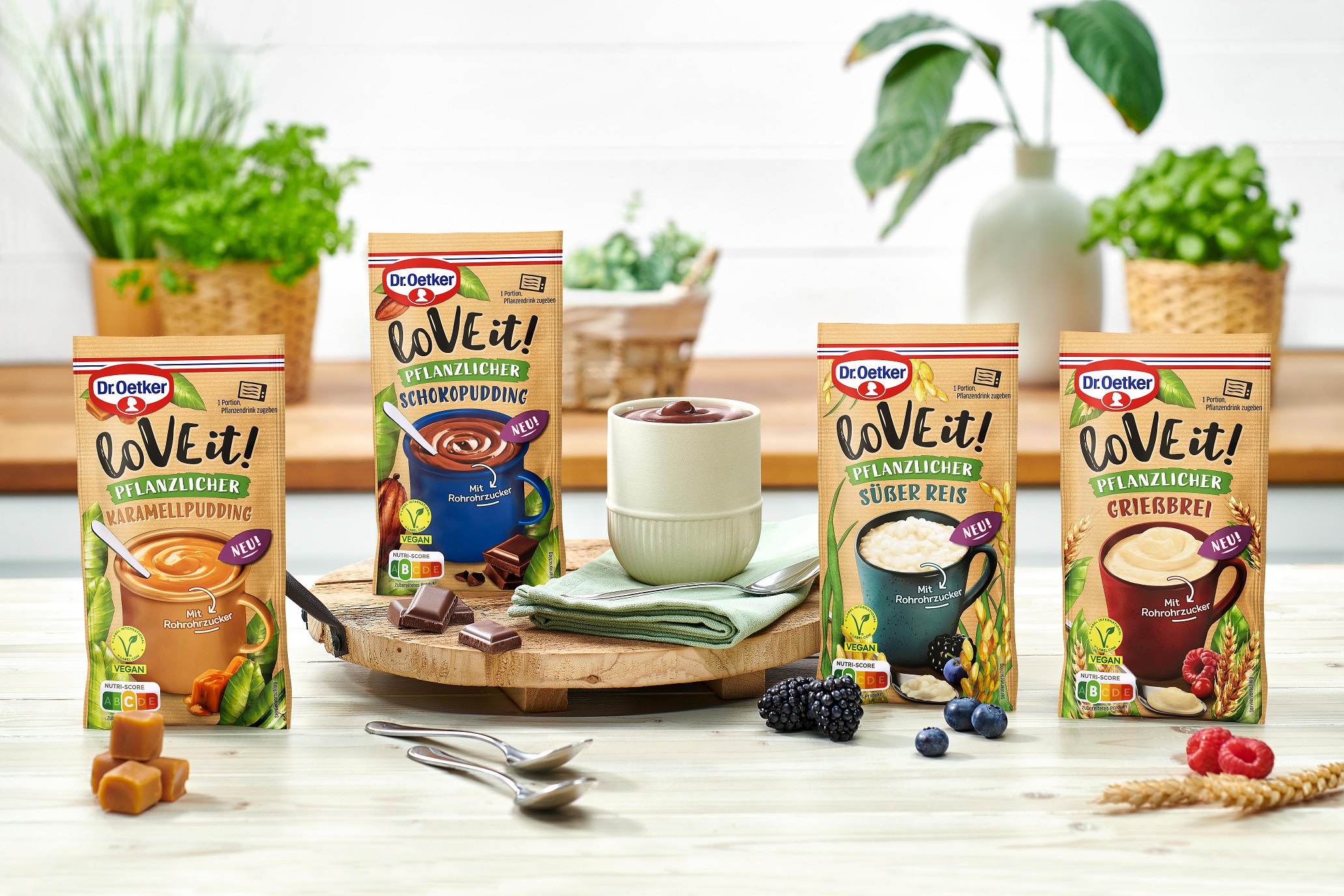 Bielefeld, Mai 2023 – Dr. Oetker erweitert die pflanzliche Range LoVE it! um vier neue Desserts: Pflanzlicher Süßer Reis, Pflanzlicher Grießbrei, Pflanzlicher Schokopudding sowie Pflanzlicher Karamellpudding sind ab Juli 2023 im Ein-Portionen-Beutel als Dessertpulver erhältlich. Die vier veganen Neuheiten werden schnell und einfach mit einem Pflanzendrink nach Wahl oder heißem Wasser in einer Tasse zubereitet. So lässt sich in kurzer Zeit ein warmes, pflanzliches Dessert zaubern.