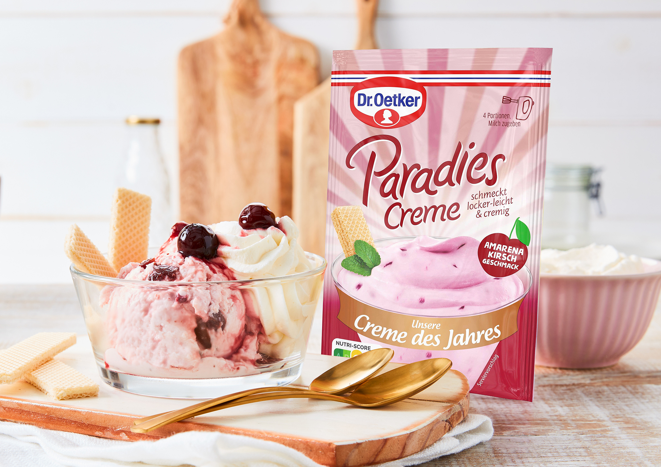 Es wird sommerlich und fruchtig: Die Paradies Creme des Jahres Amarena Kirsch Geschmack bringt ab Juni 2023 den Geschmack des Klassikers aus der Eisdiele in das Dessert-Sortiment von Dr. Oetker. Die lockere Creme mit Amarena Kirsch Geschmack und fruchtigen Sauerkirsch-Stücken ist nicht nur ideal für ein leckeres Dessert im Sommer, sie bringt auch Urlaubsflair nach Hause. Durch die einfache und schnelle Zubereitung eignet sich die Paradies Creme hervorragend bei spontanem Besuch oder für eine süße Abwechslung zwischendurch. Mit kalter Milch aufgeschlagen, sind in wenigen Minuten vier Portionen servierfertig. Auf der Verpackungsrückseite inspiriert ein Rezept für die einfache und schnelle Zubereitung eines köstlichen Amarena-Eis.