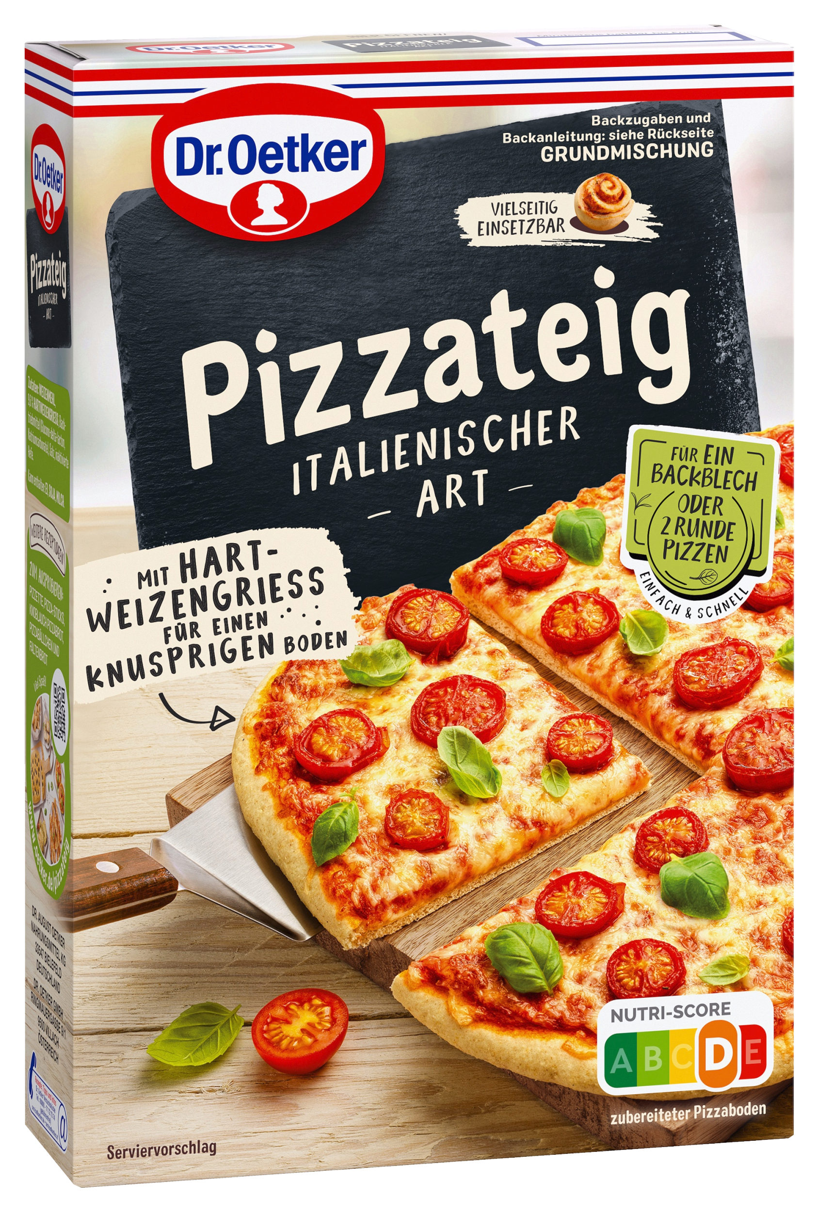 Eine köstliche Pizza zuzubereiten kann so einfach sein, besonders mit einer praktischen Backmischung. Diese nimmt viel Arbeit und langes Kneten ab. Mit der Dr. Oetker Pizzateig Italienischer Art Backmischung ist ganz ohne Gehzeit blitzschnell ein gelingsicherer, geschmackvoller Pizzaboden hergestellt. Die Zubereitung des Pizzateigs gestaltet sich äußerst simpel: Einfach die Backmischung mit Wasser und Öl zu einem Teig verarbeiten, den Teig auf einer leicht bemehlten Arbeitsfläche zu einer Rolle formen und auf dem Backblech ausrollen, nach Herzenslust belegen und dann ab in den Ofen. Die in diesem Jahr optimierte Rezeptur sorgt dank Hartweizengrieß für einen besonders knusprigen Boden. Eine Packung, die nun auch im neuen, modernen Verpackungsdesign glänzt, reicht für ein Backblech oder zwei runde Pizzen. Das Beste daran? Der Aufwand ist überschaubar, aber der Geschmack maximal. Lecker belegt kommt so der Genuss einer frisch gebackenen Pizza bequem nach Hause.