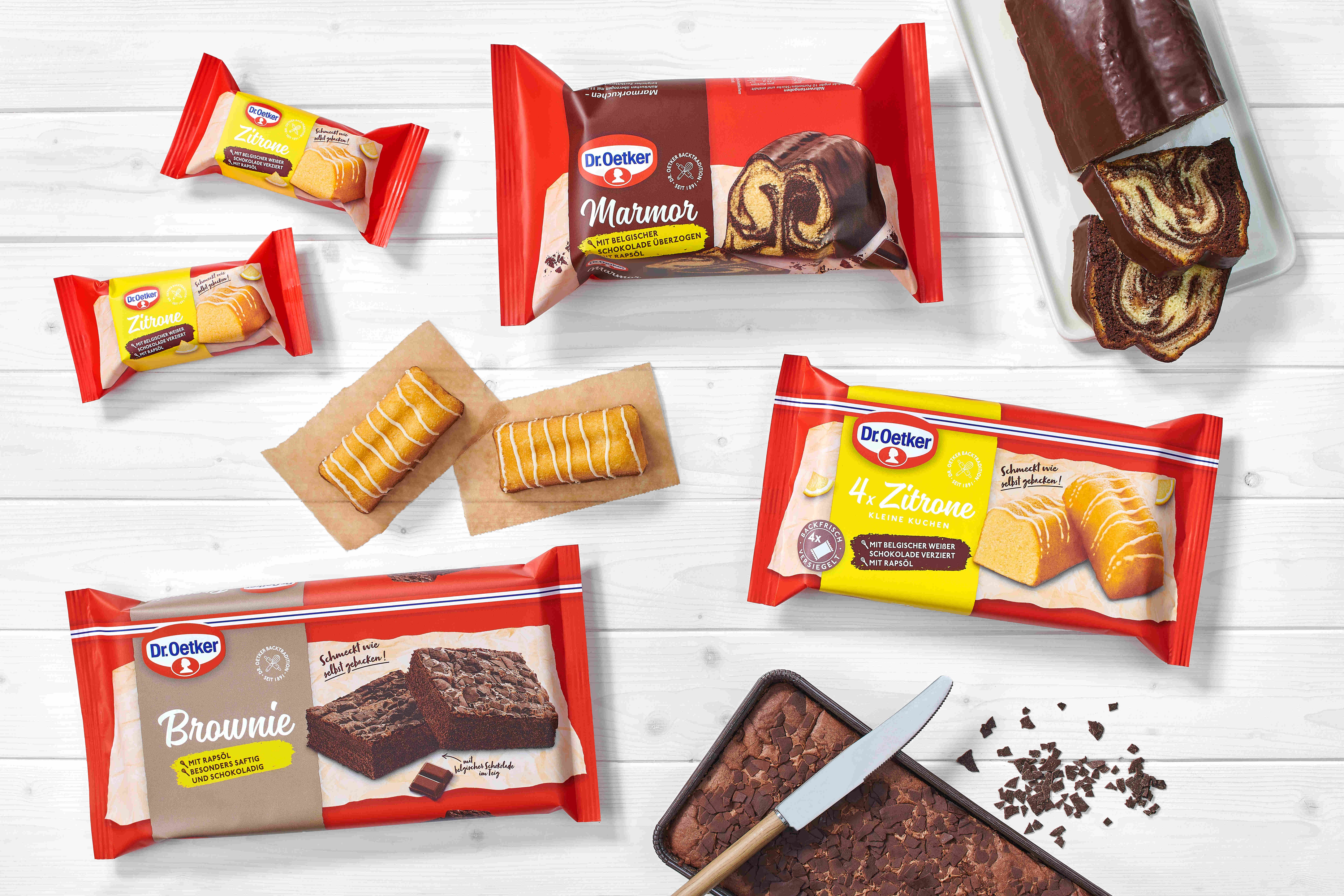 Die neuen und liebevollen Verpackungen der Fertigen Kuchen Kleine Rührkuchen, der Standard Rührkuchen sowie des Brownies treten als optische Highlights im Verkaufsregal auf und wirken noch ansprechender auf Konsumentinnen und Konsumenten. Durch das modernisierte Packaging mit neuer Schrift erhalten die Fertigen Kuchen von Dr. Oetker mehr Aufmerksamkeit im Supermarktregal und damit im wachsenden Markt der Fertigen Kuchen*. Die neuen farblich-variierenden Banderolen sorgen für eine eindeutige Sortendifferenzierung und der bekannte rote Hintergrund auf den Verpackungen für die Wiedererkennung der Dr. Oetker Fertigen Kuchen. Das Backpapier-Design auf den Verpackungen macht Lust auf den Verzehr der „wie selbstgebackenen“ Fertigen Kuchen. Der Hinweis auf die verbesserte Rezeptur sowie der Schriftzug „Schmeckt wie selbst gebacken“ unterstützen diesen positiven Eindruck.