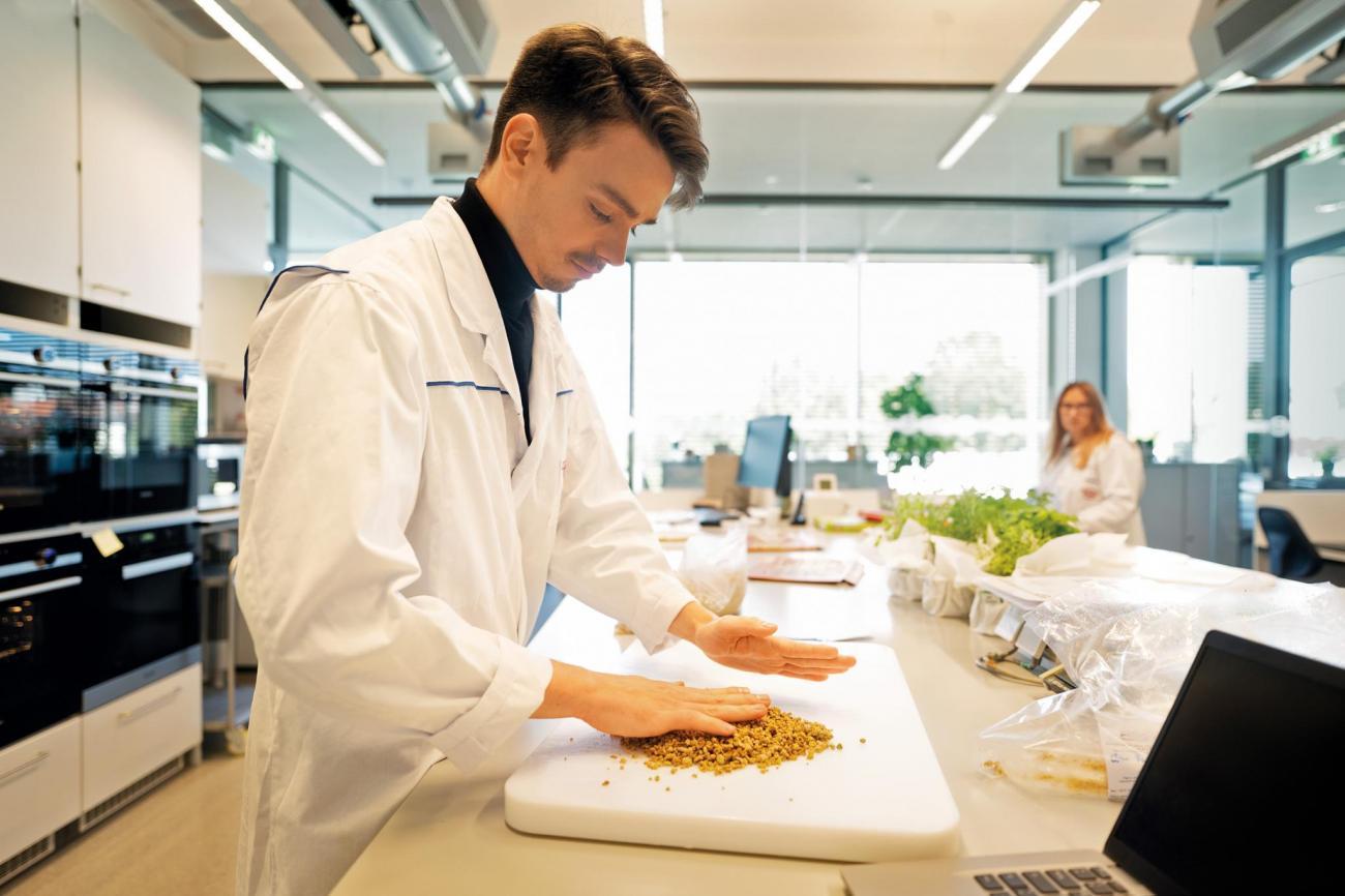 "In 2021, we first considered peas as an option for vegan products," reports Luis Aelker, Senior Quality Assurance Manager Pizza. "When processed, they have a very similar consistency and fiber structure to meat products." In order to be used as a base for vegan products, the green pulses are ground. The protein from ground peas is used to make plant-based meat alternatives.