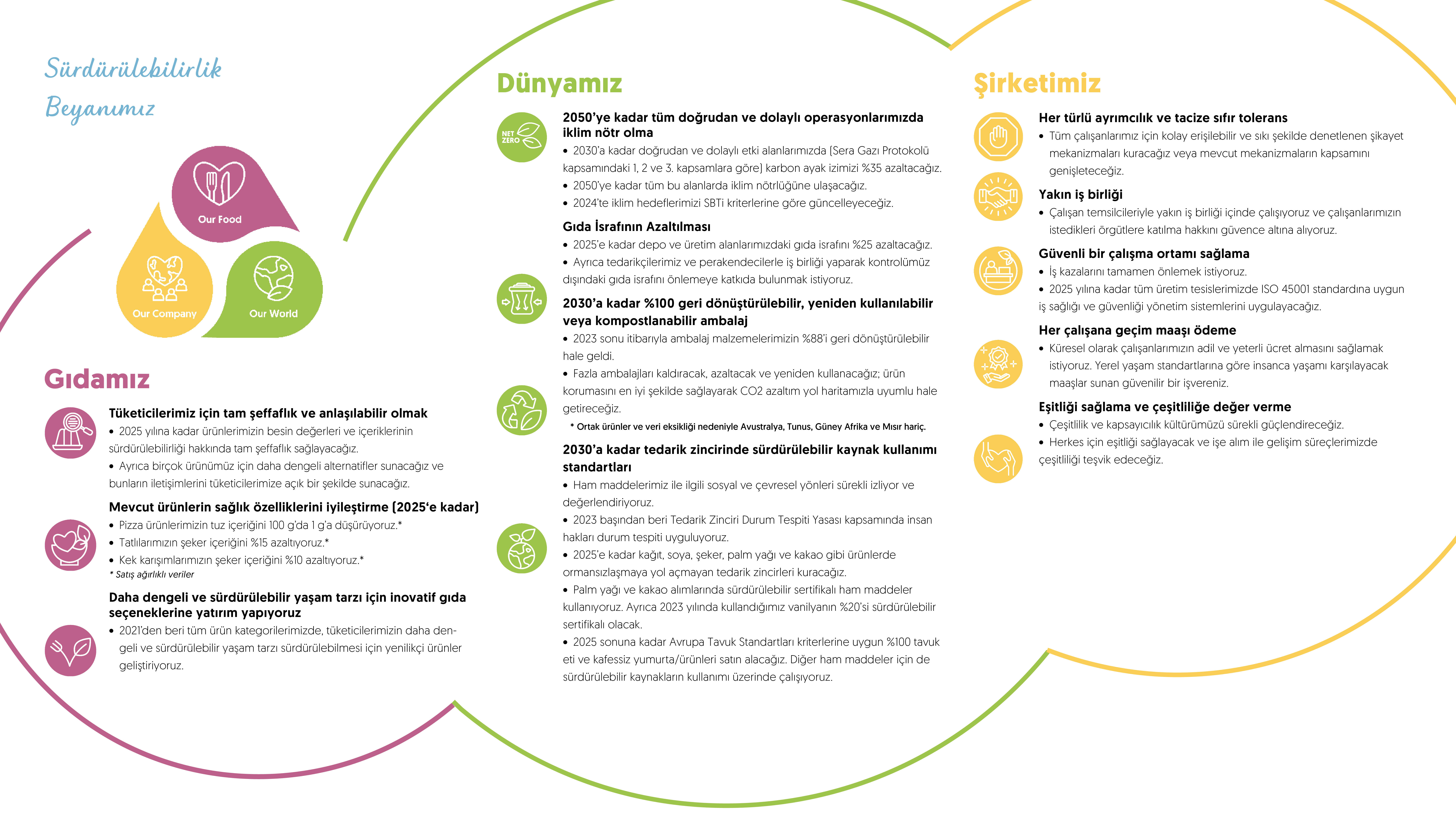 Dr. Oetker Sürdürülebilirlik Beyanımız ile sürdürülebilirlik yolunda kararlılıkla ilerliyoruz. Belirlenen hedefler üç temel kavrama dayandırılmıştır; Gıdamız, Dünyamız ve Şirketimiz.